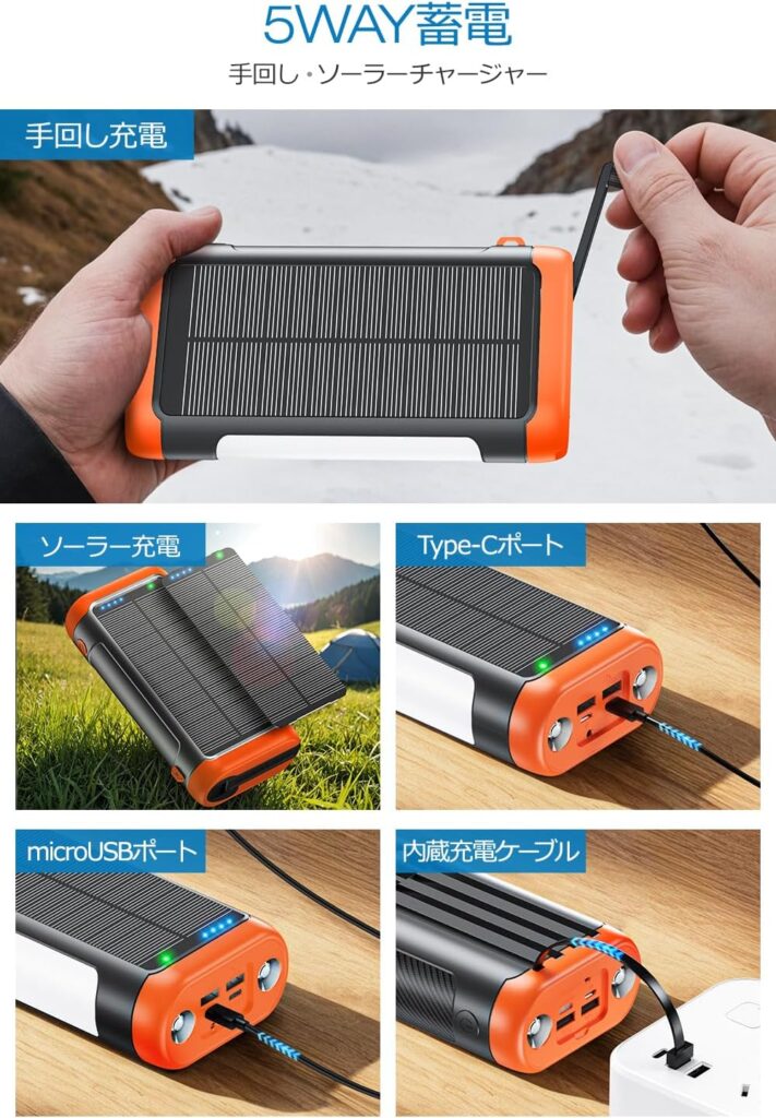 この商品はUSB Type-C充電式なので、先ほどの「ソーラーモバイルバッテリー」と組み合わせれば、